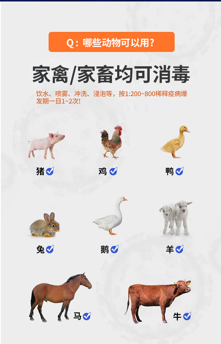 【用法用量】飲水、噴霧、沖洗、浸泡等,按1:200-800稀釋詳見標簽說明書,疫病暴發期一日1-2次