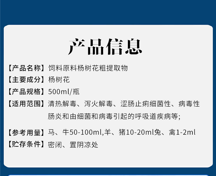 家畜:本品100ml兌水100L供飲用,或用本品100ml拌料50kg供采食,或按本品1kg體重0.1-0.2ml喂服,一日2次。