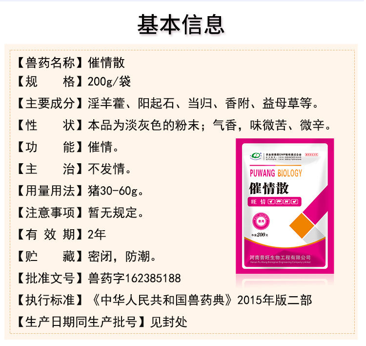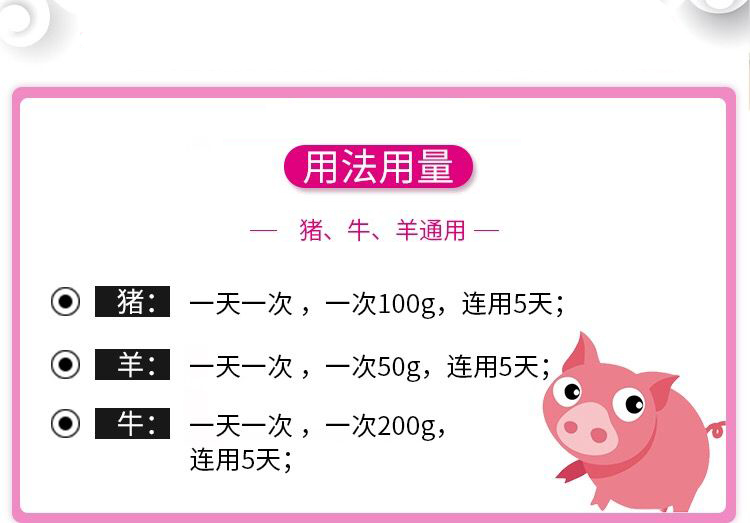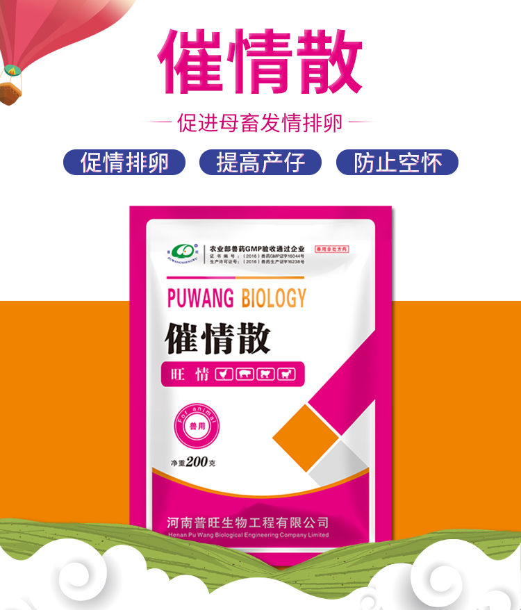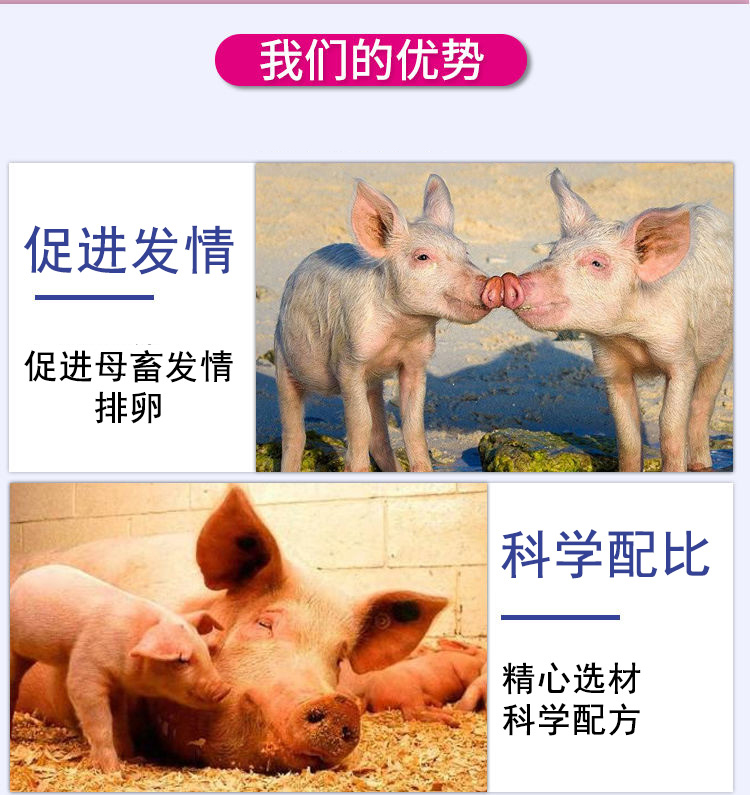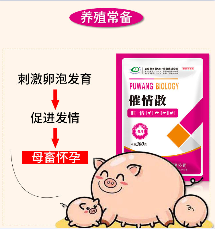 【用法用量】灌服或混飼:一次量,豬30-60g,一日1次,連用3日,一般飼喂2天后發(fā)情,發(fā)情后即可配種。