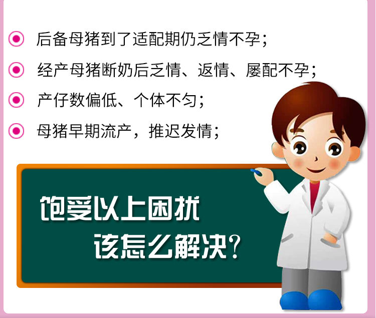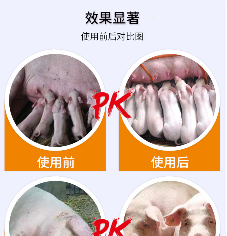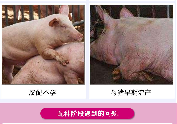 預(yù)防和治療各種原因引起的后備母豬和經(jīng)產(chǎn)母豬發(fā)情推遲、不發(fā)情、乏情、反復(fù)發(fā)情、屢配不孕、母豬早期流產(chǎn)等,提高受胎率、增加產(chǎn)仔數(shù);公豬使用可有效改善精子質(zhì)量,提高精子活力。
