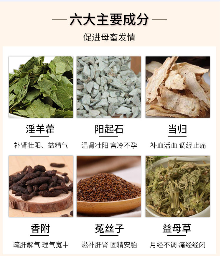【主要成分】淫羊藿、陽起石、當(dāng)歸、香附、益母草、菟絲子、生育素、激卵素。