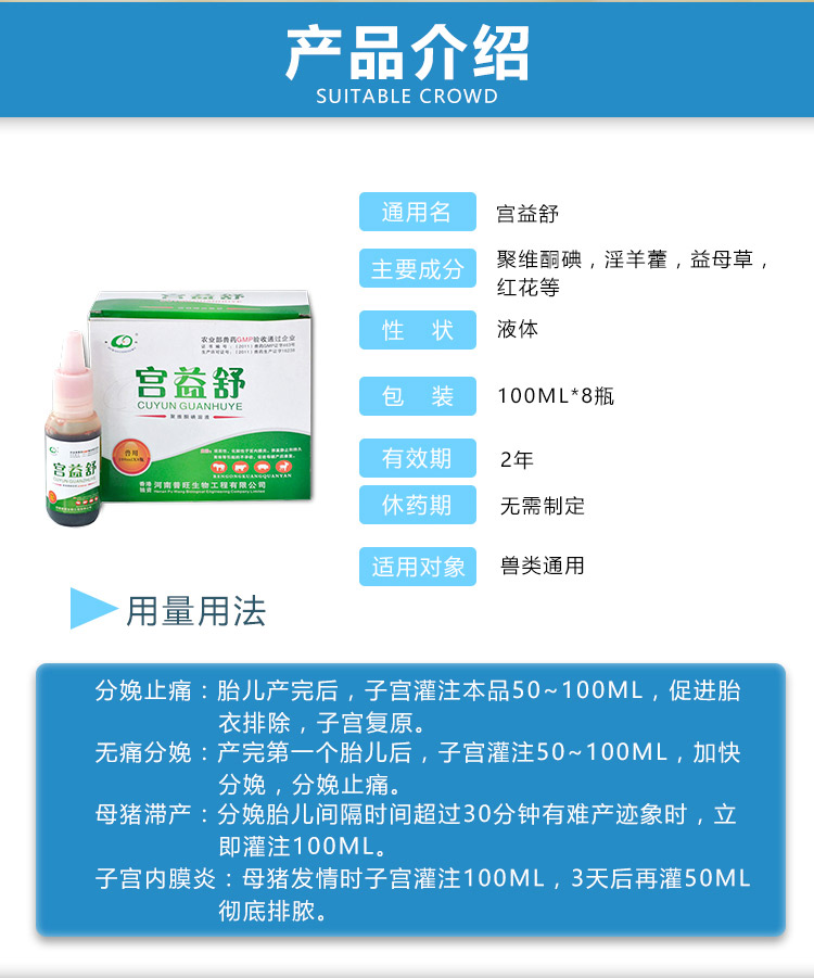 【功能主治】破結排膿,活血化淤,益氣養血,清熱解毒,催情促孕。應用中獸醫學辯證施治理論,從清理子宮內“垃圾“機理出發,經反復臨床試驗、盡心篩選、科學組方,成功開發出新一代純中草藥制劑,能快速、高效、自動清除子宮內生理“垃圾”,是治療頑固性子宮內膜炎、催情促孕的專用藥物。