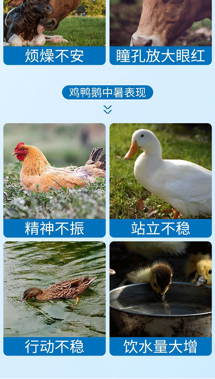 3、特別適用于防治禽獸的風寒感冒,非傳染性腹瀉和中暑,采食下降精神不振,腸胃不適,排白色或水樣稀糞、氣喘等。