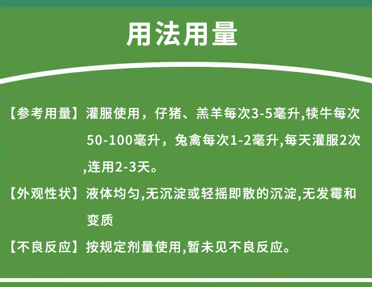 馬、牛50~100ml;羊、豬10~20ml;兔、禽1~2ml。