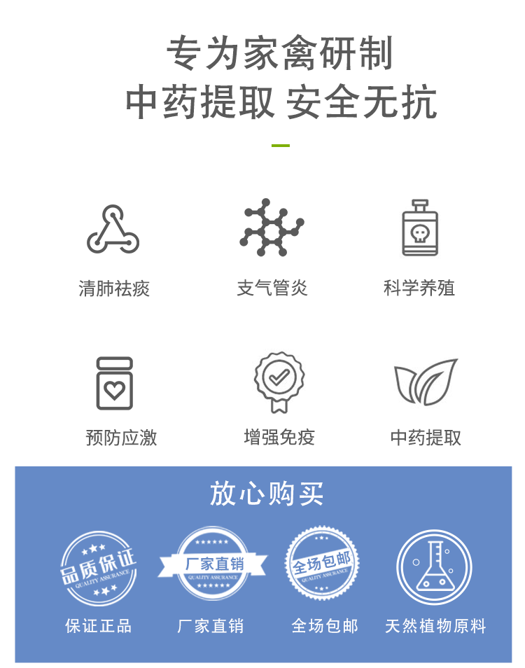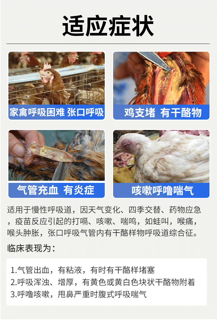 【適應癥】清熱解毒,宣肺止咳,化隱去痰,平喘利咽,主治肺熱咳喘,適用于呼吸型傳支傳喉,慢性呼吸道,因天氣變化、四季交替、藥物應急,疫苗反應引起的打嗝、咳嗽、喘鳴,如蛙叫,喉痛,喉頭腫脹,張口呼吸氣管內有干酪樣物呼吸道綜合征。