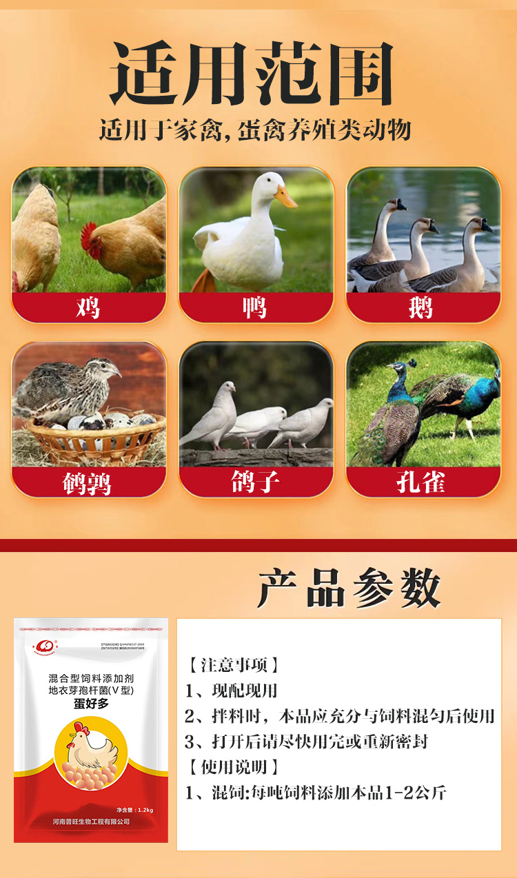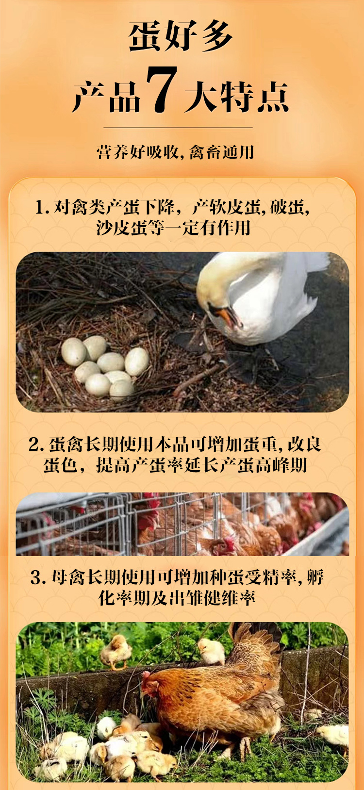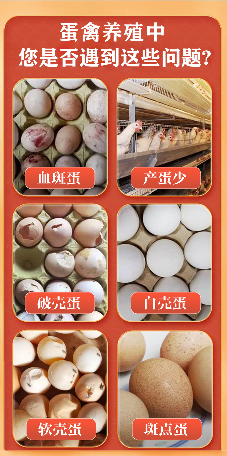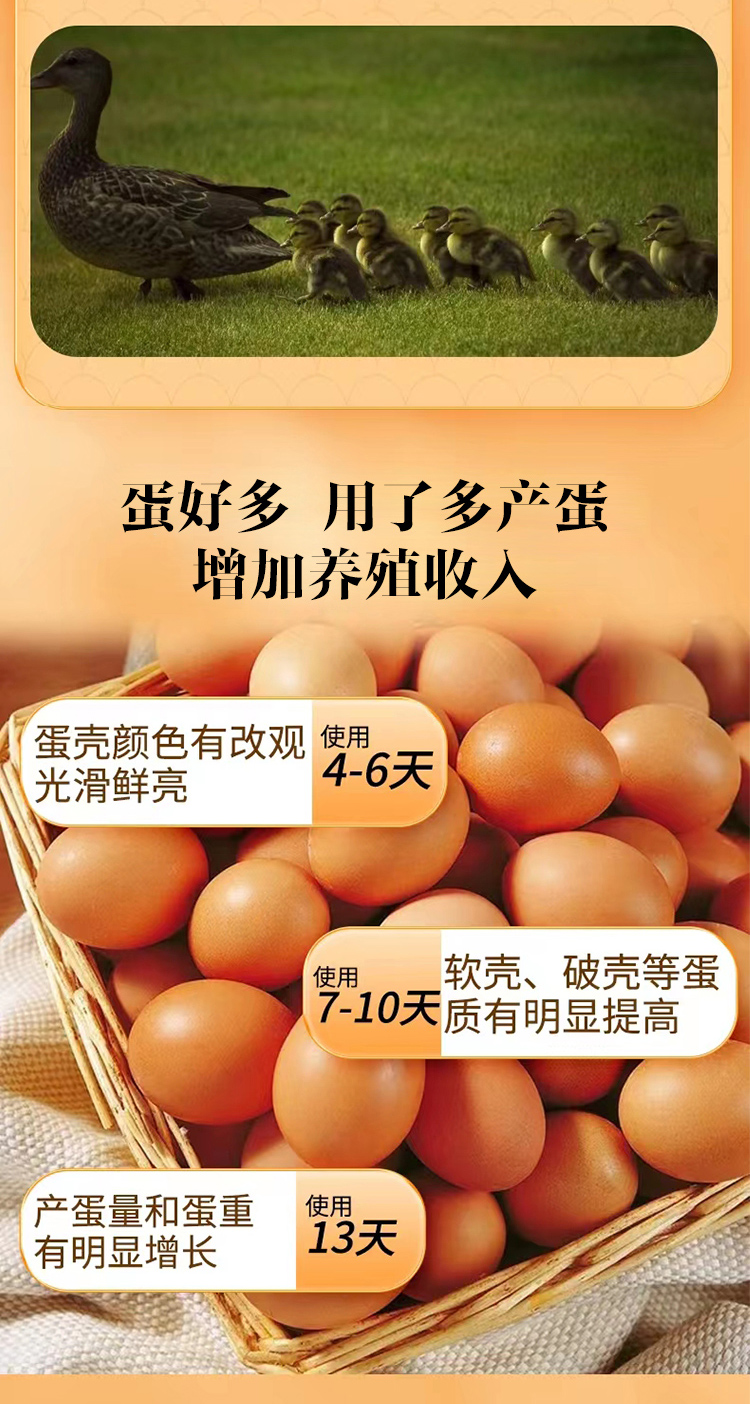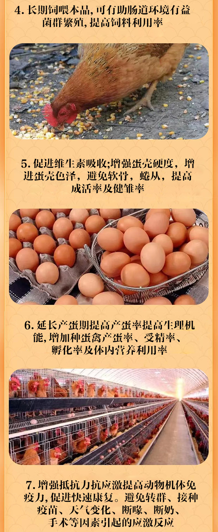 【產(chǎn)品功效】改善蛋雞腸道,降低料蛋比;提高排卵率,增加產(chǎn)蛋量,延長產(chǎn)蛋高峰期;增加蛋殼質(zhì)量,防止破殼,軟蛋殼。