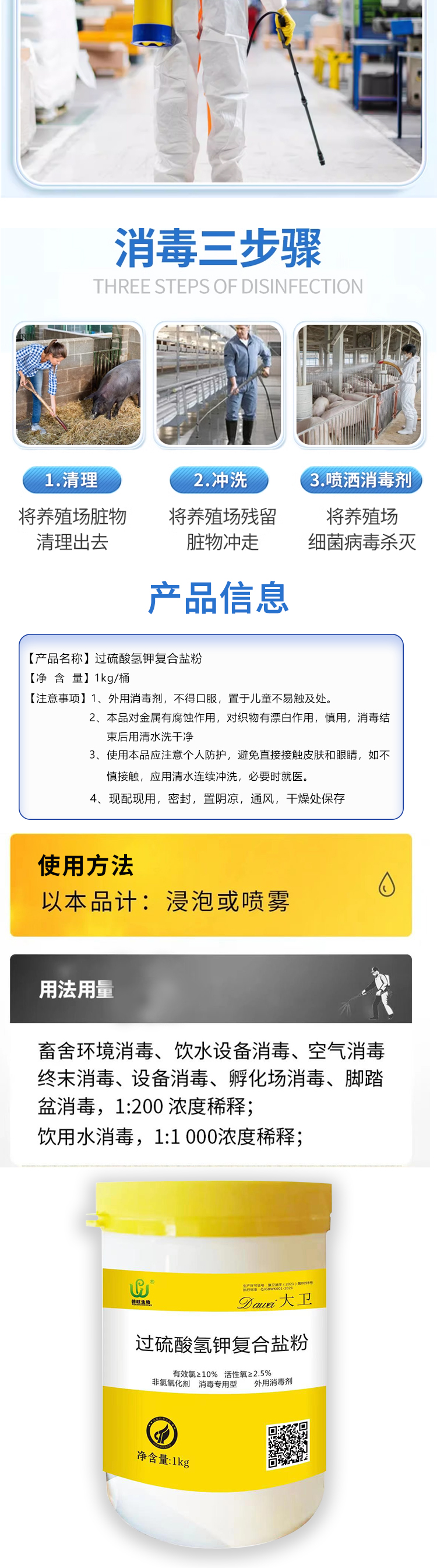 產品簡介:國產過硫酸氫鉀固體清潔劑,高含量、更省錢、效果更好。酸性消毒劑,光譜安全,有效殺滅非洲豬瘟、藍耳圓環病毒。