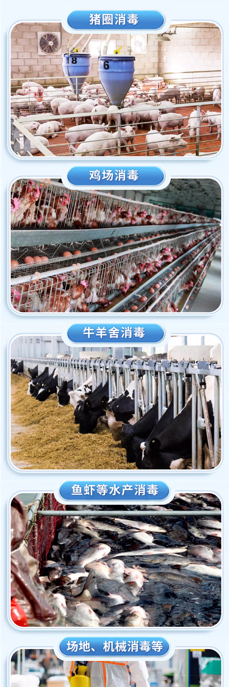 廣泛用于殺滅畜禽生產環境、廄舍、器具上的各種病原微生物,