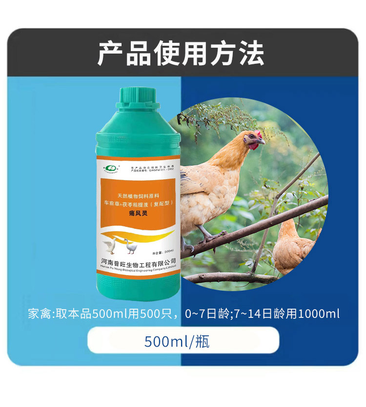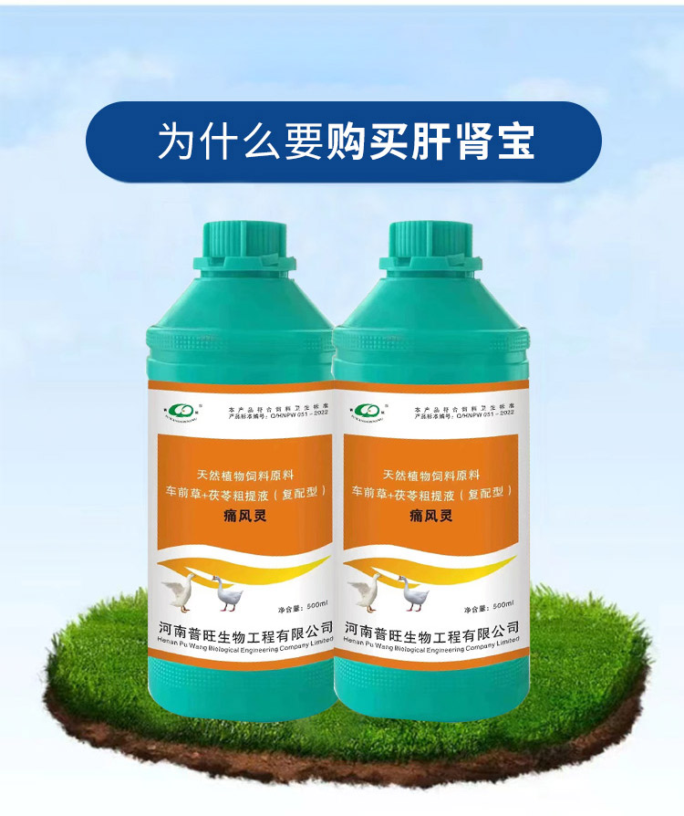 產品簡介:保肝護腎通腎、排毒利尿、增強肝臟解毒能力 混合型飼料添加劑適用對象-雞鴨鵝豬牛羊等畜禽通用。 500ml/瓶 取本品一瓶用500只0-7日齡,7-14日齡用2瓶。