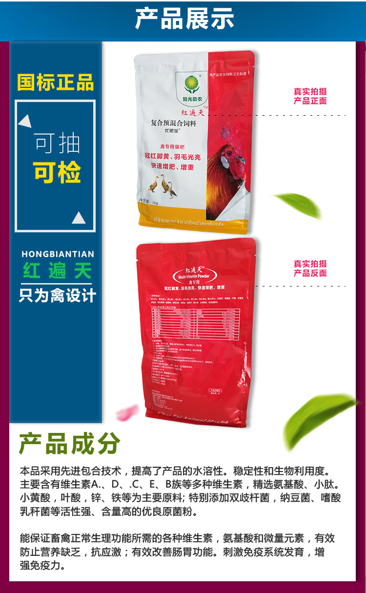 使用7天可見體型改善,明顯增重,羽毛豐盈光澤、雞冠紅亮;