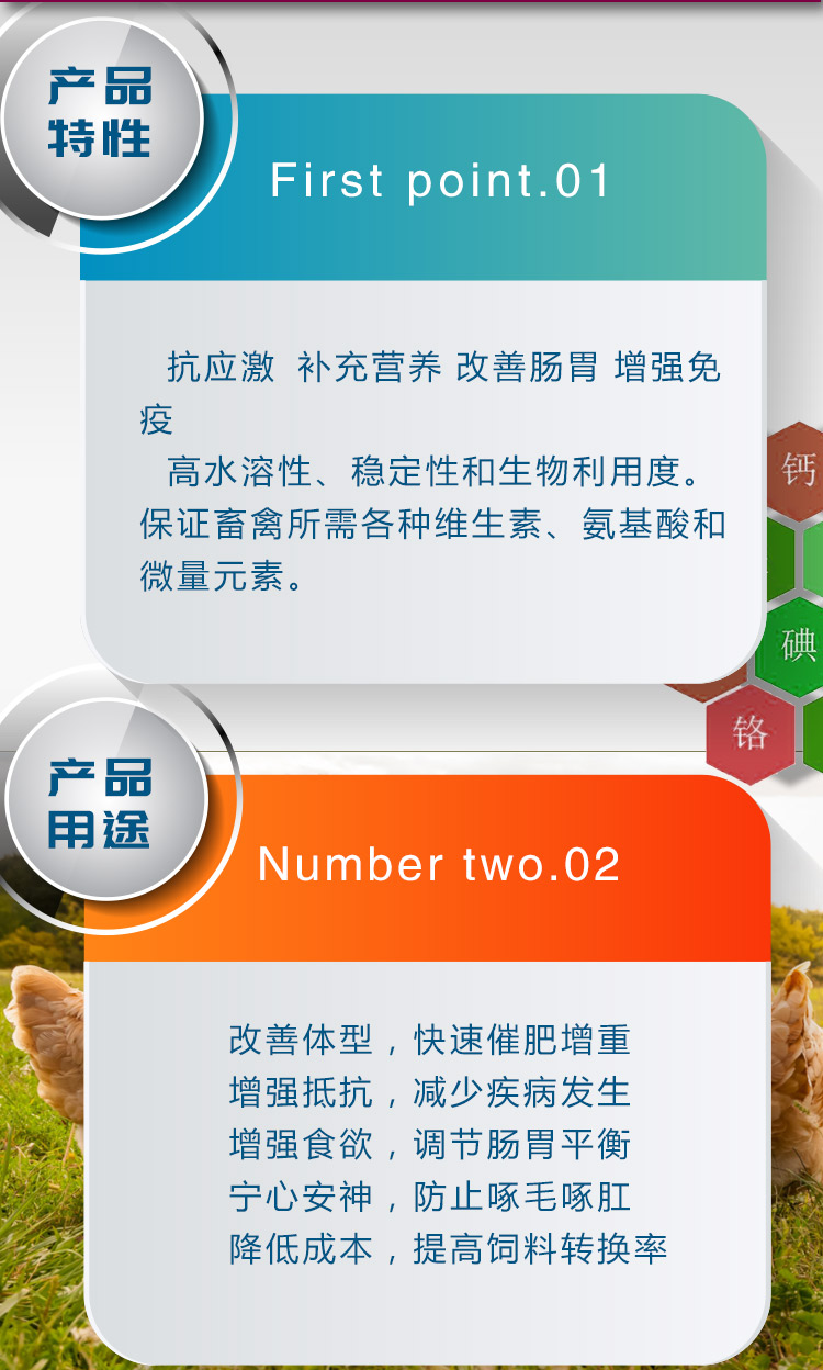 保證畜禽正常生理功能所需的各種維生素,氨基酸和微量元素,有效防止營養缺乏,抗應激;有效改善腸胃功能,刺激免疫系統發育,增強免疫力。