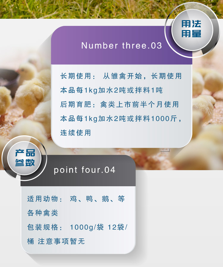 2.后期育肥:禽類上市前半個月使用,本品每1kg加水1噸或拌料1000斤,連續使用。