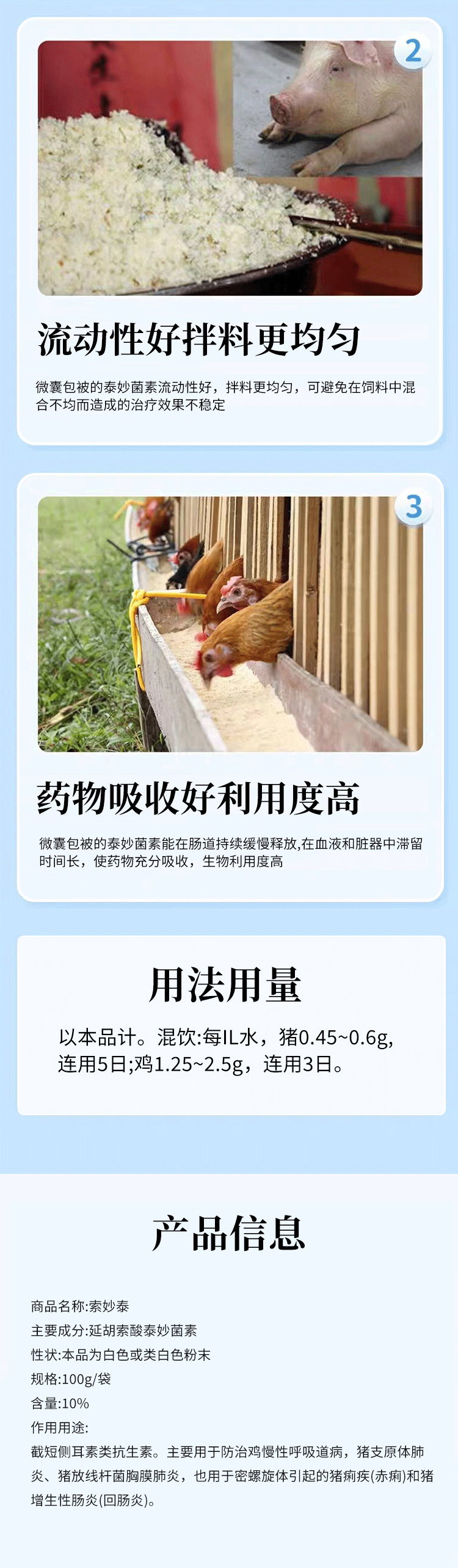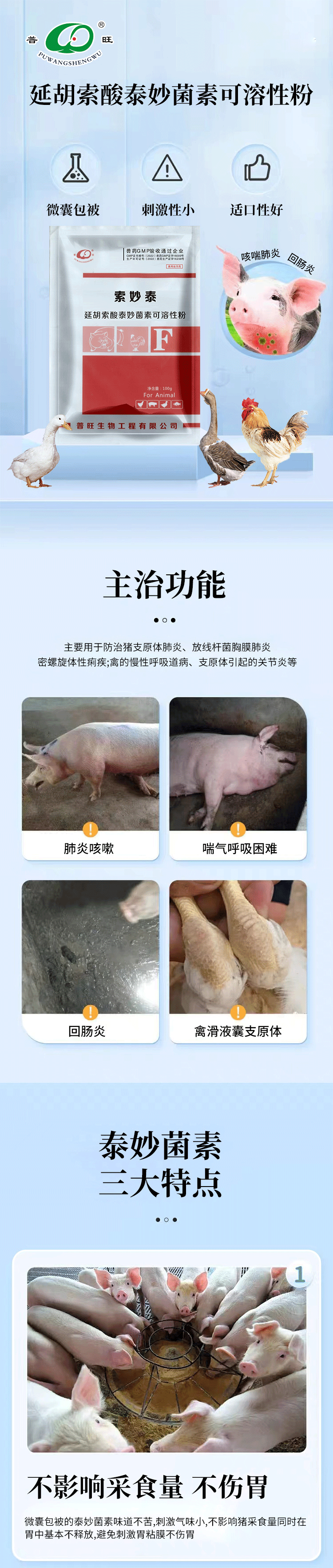 產(chǎn)品簡介:主要用于防治豬支原體肺炎、放線桿菌胸膜肺炎 密螺旋體性痢疾;離的饅性呼吸道病、支原體引起的關(guān)節(jié)炎等